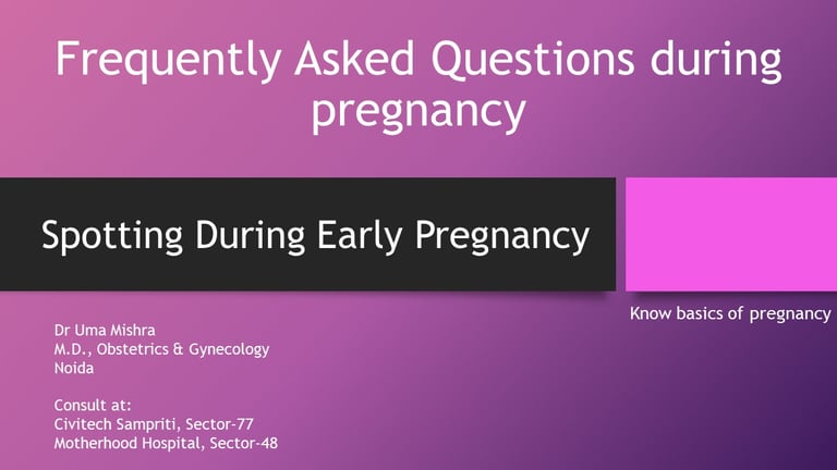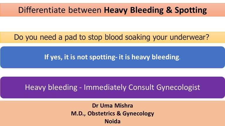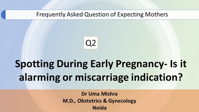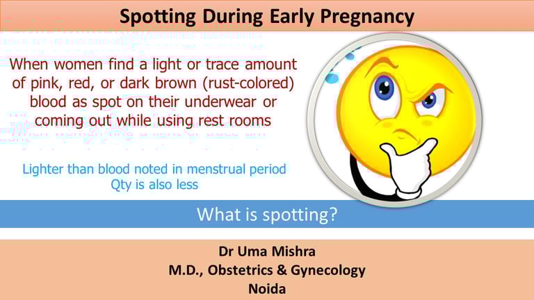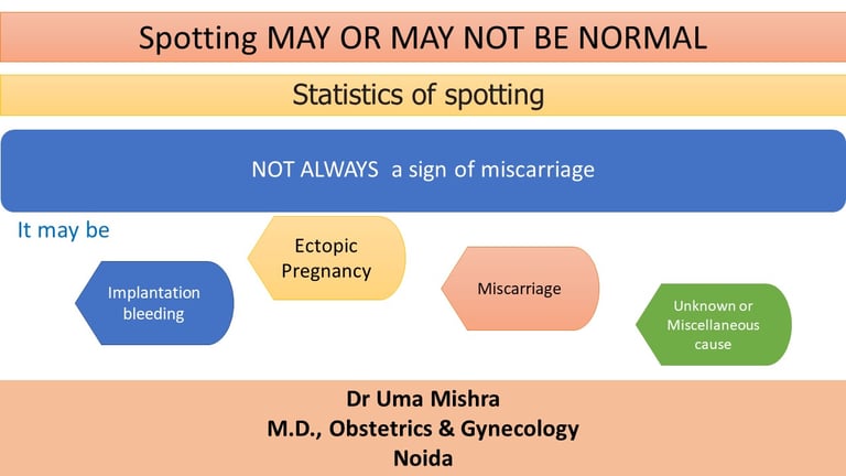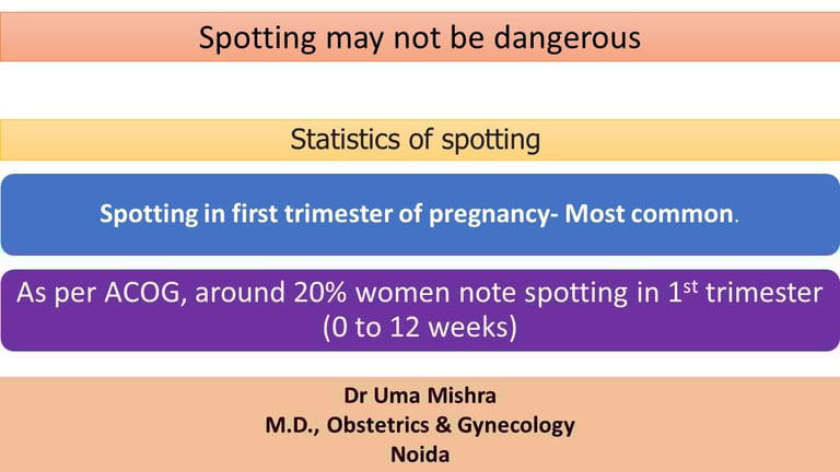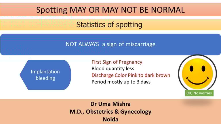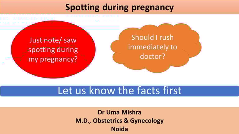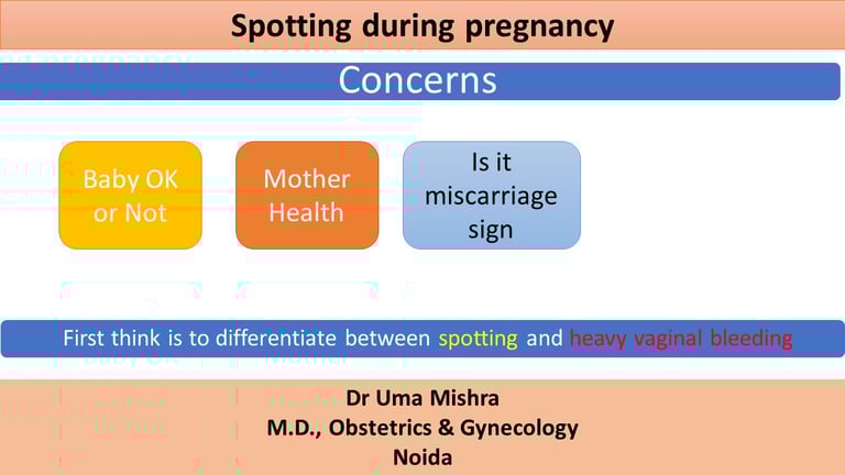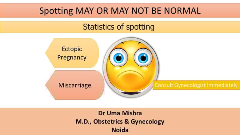 Expecting mothers are stressed out when they notice spotting. In this article we are going to discuss, what is spotting and how serious it is. Whether it is a definitive indication of miscarriage? Through pictures in the gallery below you can get the information about this frequently faced Gynecological issue by expecting mothers. Comment your own experiences also. In case any advise is required, feel free to contact. Dr Uma Mishra, M.D., Noida